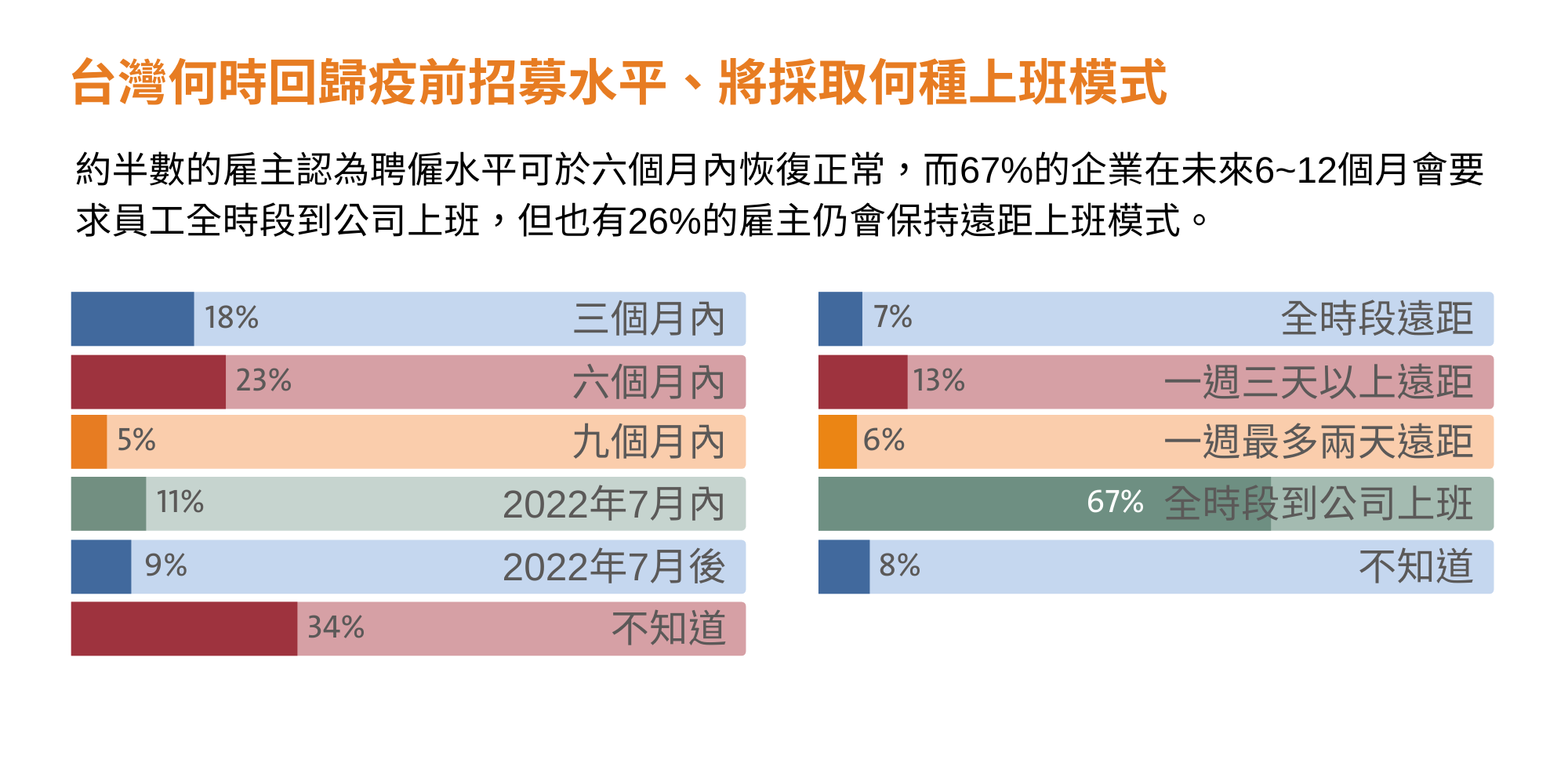 疫情警戒仍處於二級,許多企業也持續執行分流上班或居家辦公。本次調查也一併詢問雇主對未來上班模式會有什麼改變。結果顯示67%的企業在未來6~12個月會要求員工恢復正常上班,但也有26%的雇主仍會保持遠距上班模式,只是每周實行的天數會依產業性質從2天到5天不等,顯示許多企業在這段期間,已開始熟悉遠距上班的工作方式,也認為是理想的工作模式。
